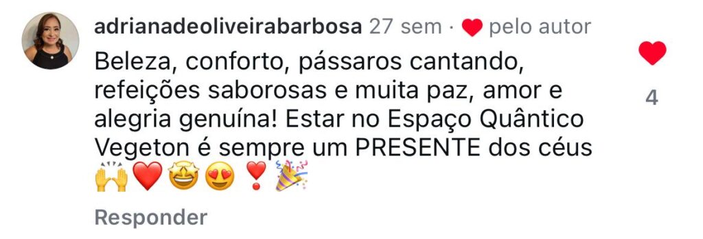 • Nossa alimentação será 100% saudável, completa e vibracional (incluída no retiro). Se desejar, pode trazer algo para consumo pessoal.